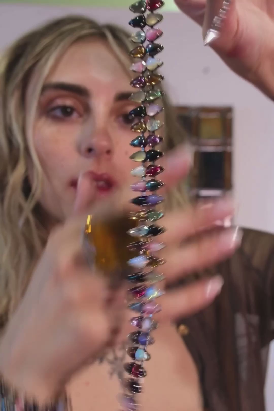 - A GLOWING GLASS CHOKER MADE OF MINI, DOUBLE MULTICOLOR FANG SHAPED STONES. THIS CHOKER SITS FLUSH AGAINST THE NECK.
