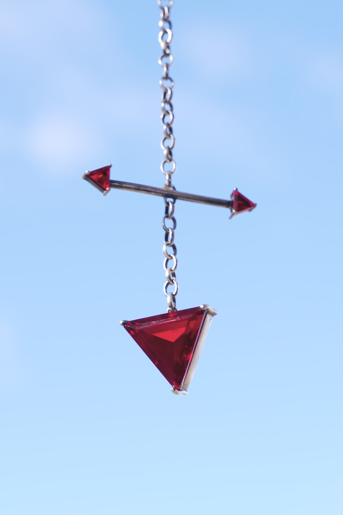 - A SOLID SILVER CHAIN NECKLACE WITH A TOGGLE CLOSURE AND A BLOOD RED FACETED GLASS STONE.