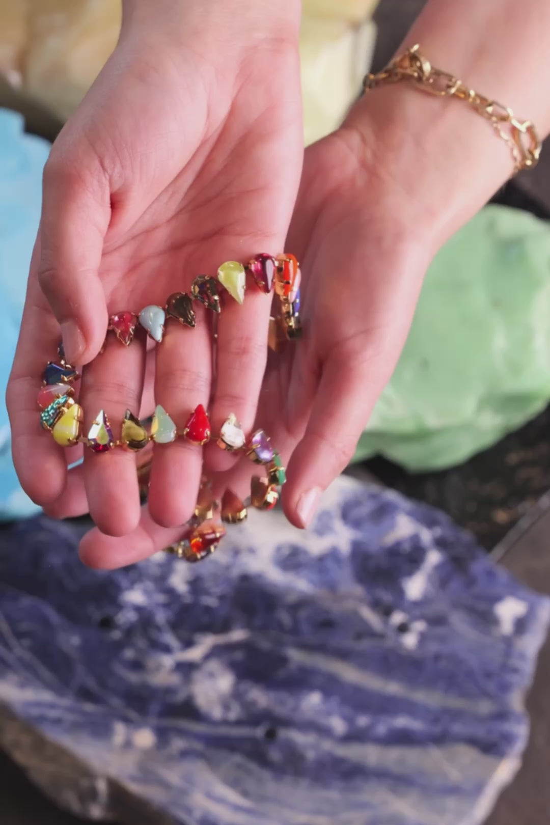 - A GLOWING GLASS CHOKER MADE OF MULTICOLOR FANG SHAPED STONES.