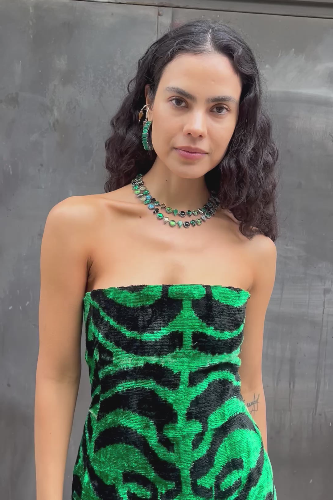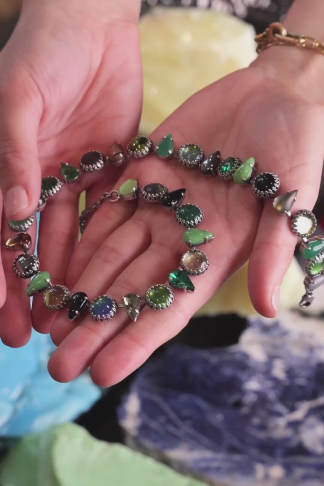 - A GLOWING GLASS CHOKER MADE OF ALLIGATOR GREENS WITH ALTERNATING ROUND AND FANG SHAPED STONES.