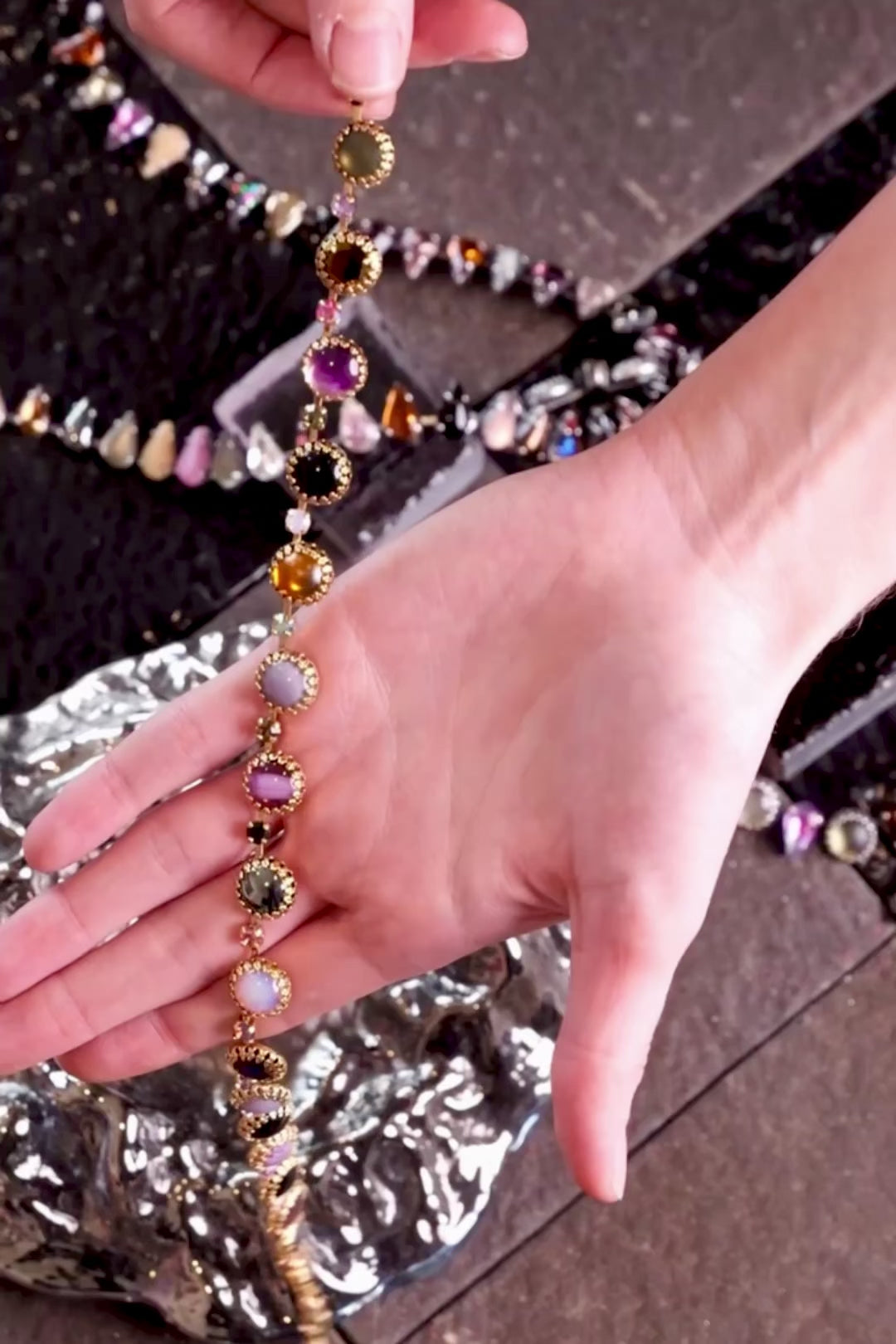 - A GLOWING GLASS CHOKER MADE OF MULTICOLOR ROUND STONES ALTERNATING BETWEEN TWINKLING CRYSTALS.