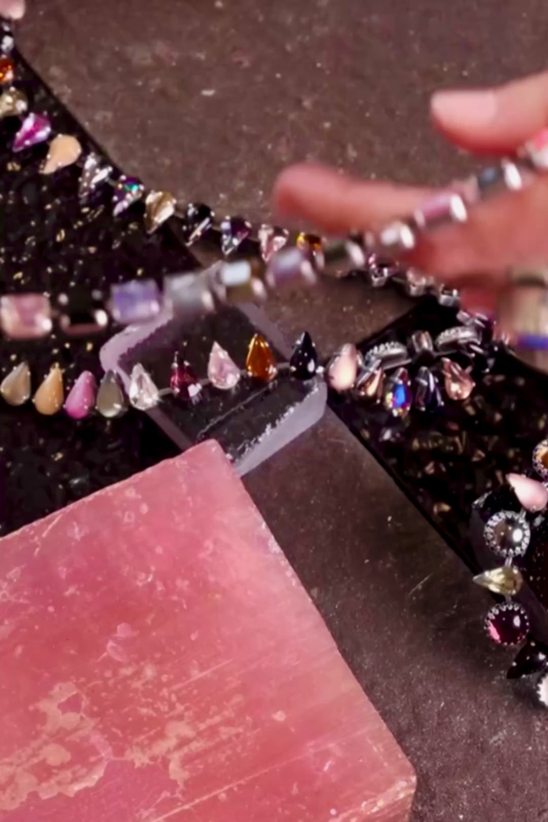 - A GLOWING GLASS CHOKER MADE OF MULTICOLOR BAGUETTE STONES.